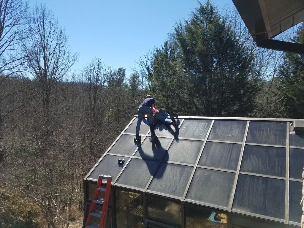 I snapped a photo of the workers on our greenhouse roof today. If you look closely, you can see the giant suction cups which are required for them to carefully move around. This is not a job for the faint of heart! When exhaust fans need to be replaced or a seal repaired, it takes special equipment to move around two stories up on the glass rooftop of our greenhouse.
