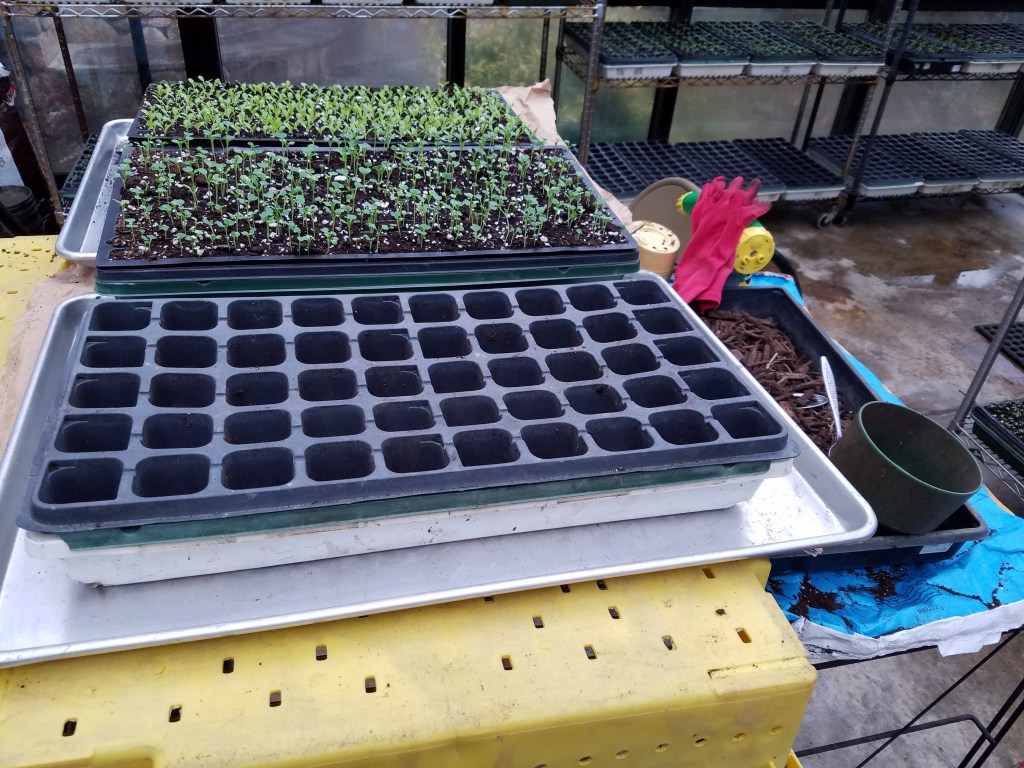 Speaking of always learning something new . . . do you see the silver trays in the photo? This year Robert came up with the idea of using these trays at our workstations to help contain the soil spillage. I cannot believe it took us twenty-eight years to come up with this idea! It really does work. Anything that makes “clean up” and “keeping clean” easier is something I am in favor of implementing.