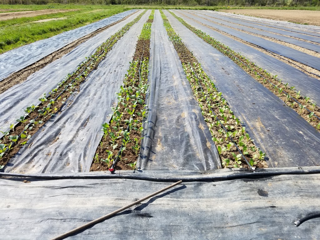 At the same time, thousands of plants have been already transplanted into the gardens. We are seeing strong root systems and the weather is perfect which means the plants will grow quickly into all those greens which make the first salads! We are hoping that the freezing temperatures do not last long tonight–for the sake of the apple trees and the blueberry bushes! The wind is blowing which will help to keep the frost at bay and our garden is located in a valley. Also, the black fabric will retain some of today’s sun heat which will also help our plants to stay warm (we trust).