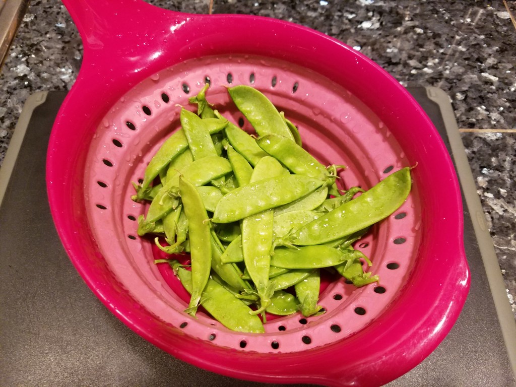 This week we have red and green romaine and red, butter head lettuce, endive, escarole, green and purple kohlrabi, no-so-pretty broccoli and pretty cauliflower. Added this week are sugar snap peas! We call these “the Farmer’s Candy.”
