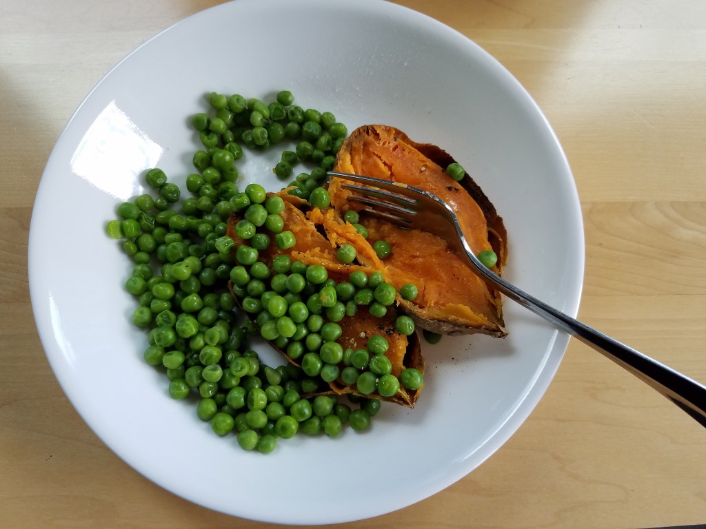 Food has power and can be a unifying force. Food is central to the lives and livelihoods of us all. I practice what I preach when it comes to diet. My lunch . . . a baked sweet potato topped with sweet, green peas. This is the last sweet potato from 2020, but the organic peas came from a grocery store freezer aisle.