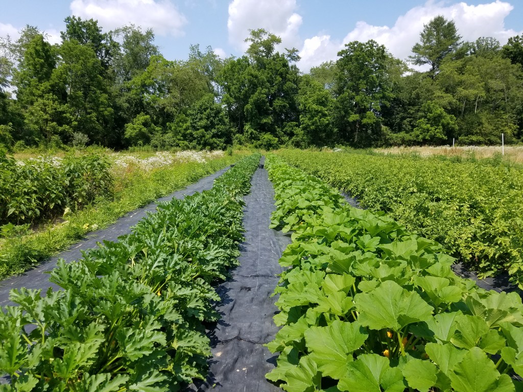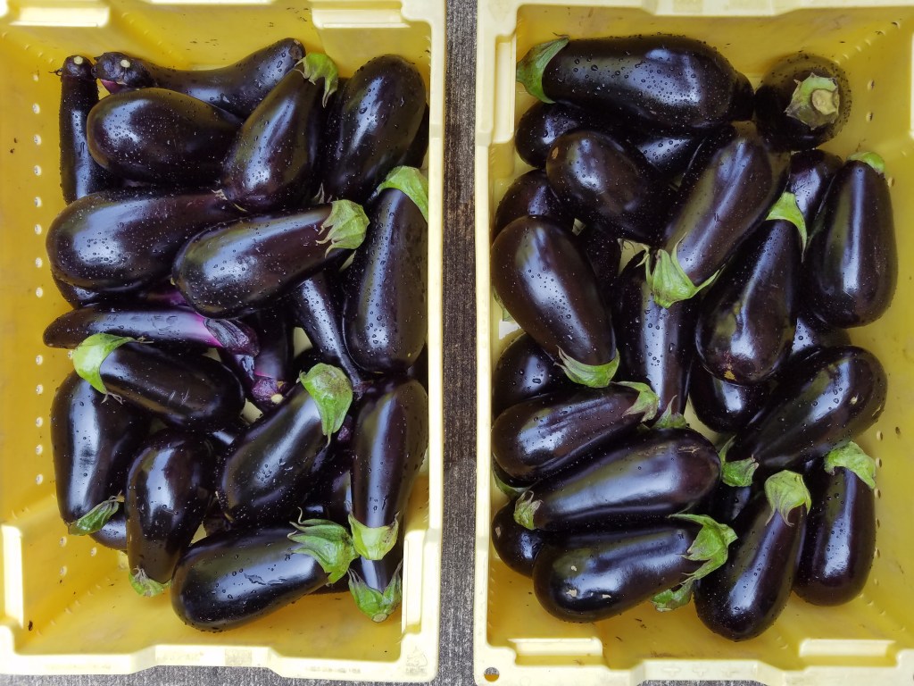 In the upcoming CSA Boxes you can expect a variety of patty pan squash and zucchini and zephyr squash. These crops will be slightly dwindling, but some may be around for at least another month! 2021 is a good year for squash and our specialty cukes! Also expect traditional eggplant, Asian eggplant, cabbage, green beans and/or okra, depending on the day. A variety of potatoes are being harvested and sweet bell peppers are on the near horizon. Tomatoes will be late, but are looking good. They keep growing and Robert continues to tie them higher up the stakes! It is SUMMERTIME and the eating is good–even if our evening meal frequently takes place after 10 p.m.!! Oh, yeah . . .