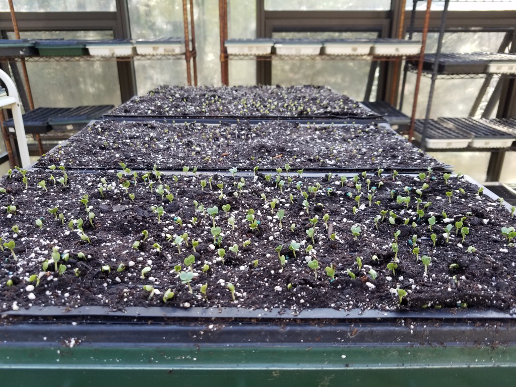 Above are some our our seedbeds awaiting seeds. Each seedbed tray has ten rows and each row has approximately 30 seeds. The beds are started in waves so always we have plants in a variety of stages. On the back shelf, you can see seven of the first seedbeds started. Obviously, all cannot be transplanted in one day! This is why we need “waves” of beds. These staggered waves also provide our week upon week of veggies for our CSA Boxes.