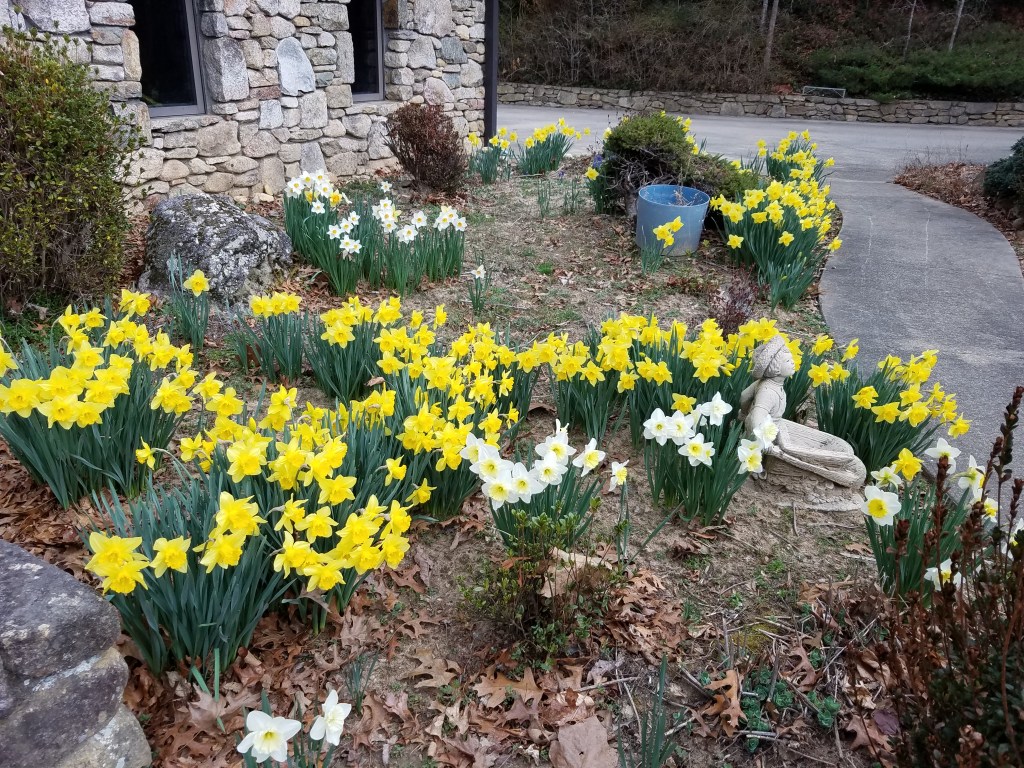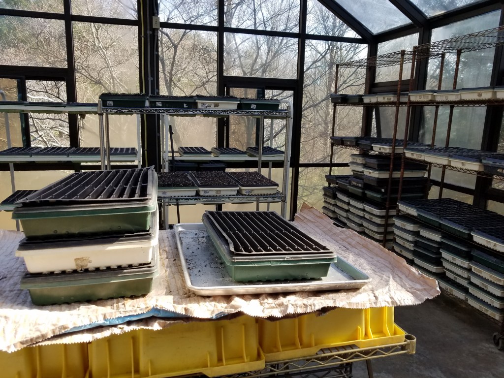 I love the month of March! The daffodils are blooming, Spring is just around the corner and we are planting seeds. We pray with faith these seeds will fall on fertile soil, take root, and produce fruit (and veggies). As farmers, we are not in favor of an early spring, however. When spring arrives too early, the plants and trees have premature bud burst. Then when that inevitable WNC mid-April cold snap arrives, the new vegetative growth is not cold-hardy and everything from apples and blueberries to early vegetable gardens and ornamental plantings are susceptible to the frost and freeze. The cold rain we are getting this afternoon is seasonal and more to our liking. This type of weather makes for pleasant hours in the greenhouse transplanting seedlings from the seedbeds to their individual pots where they reside until transplanted once again to the field gardens!