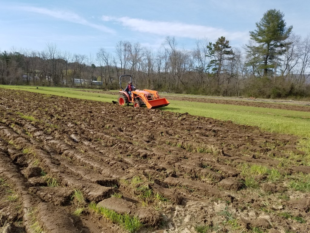 The rye which was planted in the field last fall has been tilled under in some of the gardens we will be using. This proved to be a rather muddy job, but we trust in a few more days another pass can be made to loosen the soil in preparation of laying down the fabric and so the planting can commence.