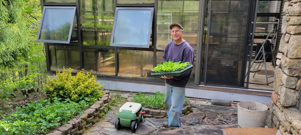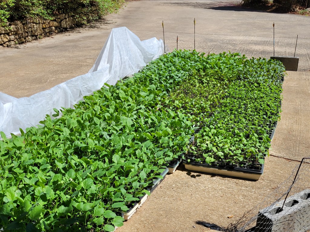 The plants look small in the field, but they will grow quickly. We trust that in one month’s time they will be going into out CSA Boxes for your first fresh spring salads!! I am continuing to transplant, and we repeat the process. Here is the next wave of plants leaving the greenhouse to go into the “hardening off” area of our driveway. Going directly from the greenhouse to the field is too much of a shock for the tender leaves. After a couple of weeks “in the real world,” they ready to for the final transplant.