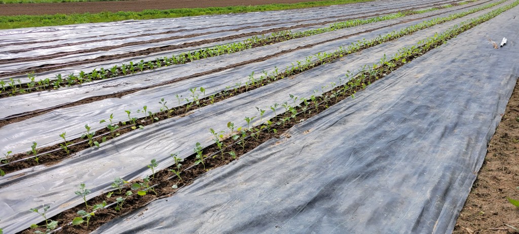 We thought we might need to put the frost cloth again this weekend, but it turned out to be absolutely perfect weather for planting our first broccoli, cauliflower, cabbages, choi, tatsoi, kale, and kohlrabi. These types of plants like cooler weather. Easter weekend Robert put the potatoes into the ground–one week later than usual, but the ground was too wet before. You can see the first four rows planted in the photo below. Notice the drip tape running down the middle of the plants. Our water is sourced from deep, drilled wells.