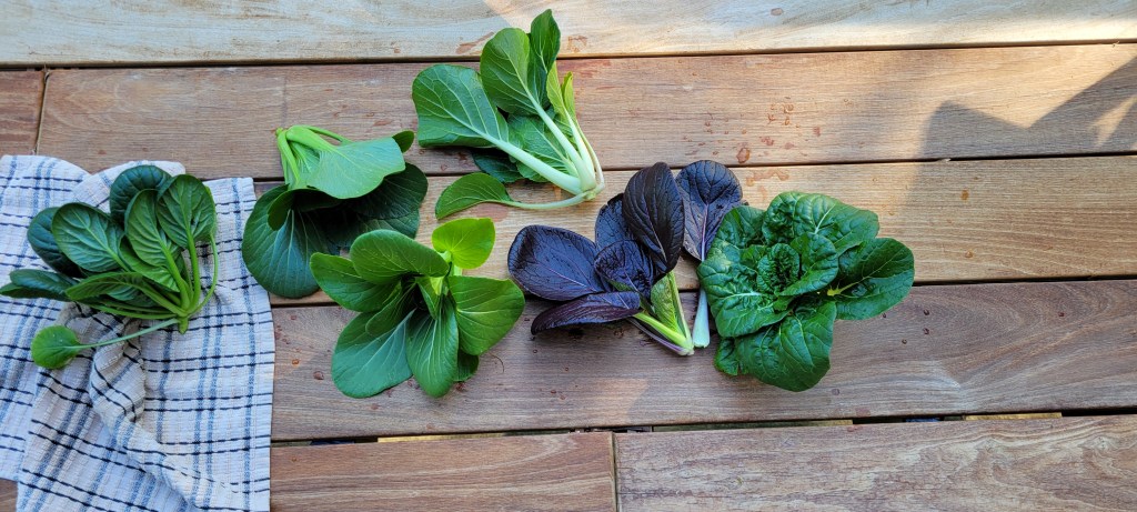 The item in the photo on towel is called Tatsoi. This can go into your salads, too. You have seen this before I am sure, but usually they are quite LARGE in size. We attempt to harvest as seasonal gourmet vegetables. Of course, anything in the soil will continue to grow until it is harvested so they will get bigger as the weeks pass. We do plant our crops in “waves,” but sometimes the weather conditions still cause everything to grow at the same rate. Gardening can be tricky!