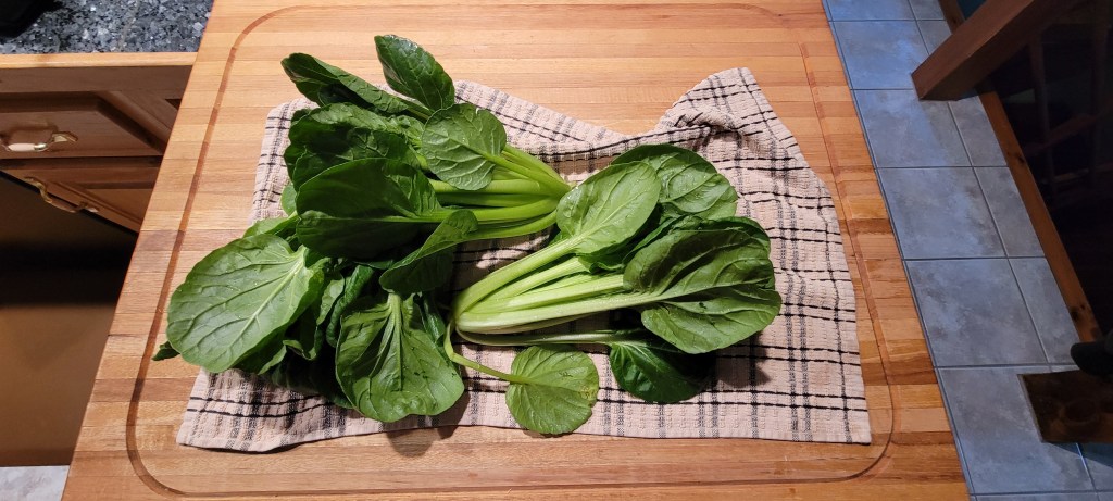 Three (3) tatsoi are pictured in the photo above on my cutting board. And for your information, the cutting board measures 25 1/2 by 31 inches! We can do some serious chopping on this board!! One of our favorite ways to make tatsoi is TATSOI RICOTTA QUICHE CAKES. The recipe is under “T’. I realize my recipe pages are not particularly sophisticated, but you can be sure we have tested them all. This Asian green is in the bitter family and has lots of Vitamin C. I do include the stem in all of my recipes.