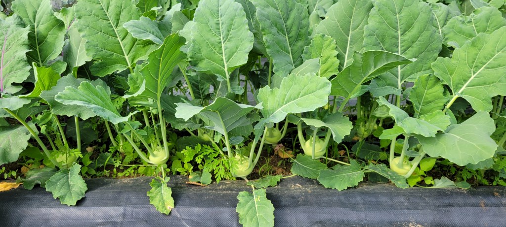 The kohlrabi are also growing to the point when I can photograph them. If you have never had kohlrabi before, we think you will enjoy this unusual, crunchy vegetable! More on this later . . . they need to grow a bit before they can be harvested. They grow right on top of the soil and look a bit like little “space ships” that have landed in the garden.
