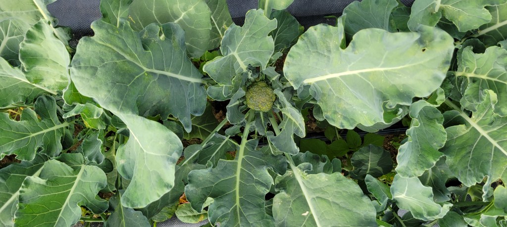 It has been dry in May so we have been using our underground drip irrigation system. The weatherman says we may get about three inches of rain this weekend. Robert believes the soil is so dry that will absorb it all. The plants always prefer rain from the Heavens over drip irrigation! Below is one of our three broccoli varieties. As you can see the heads are beginning to form! Yay!!