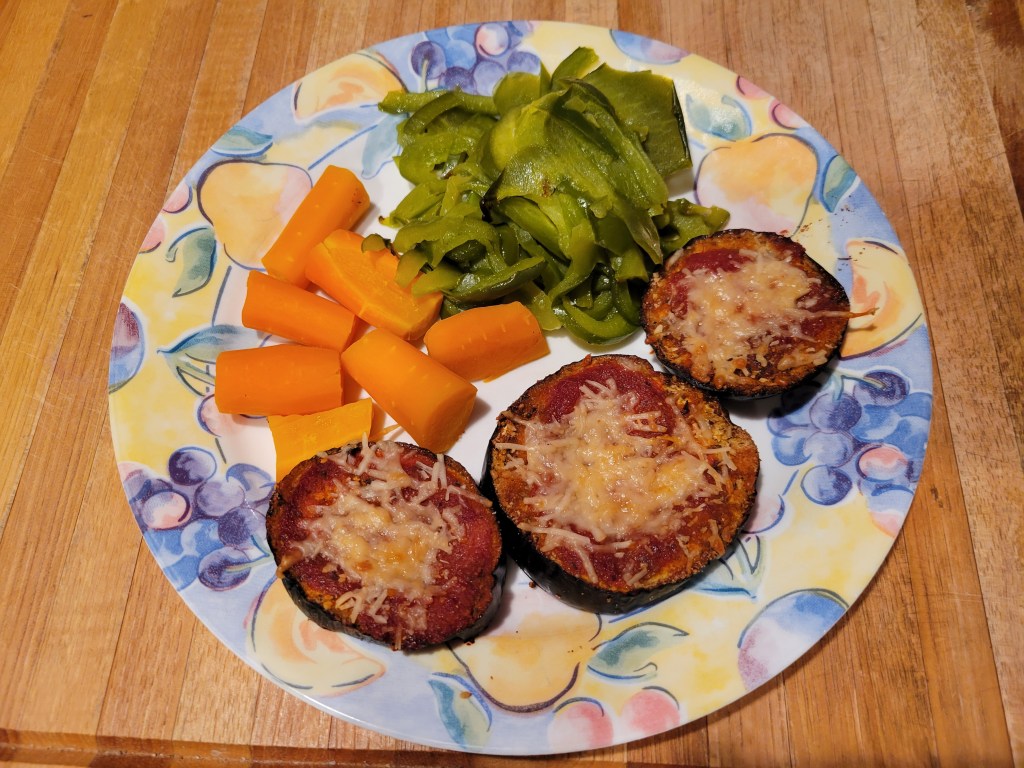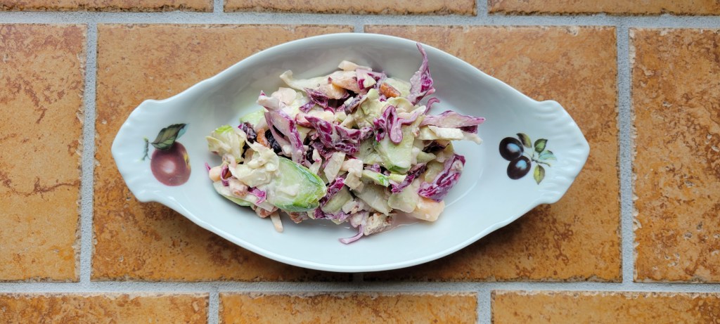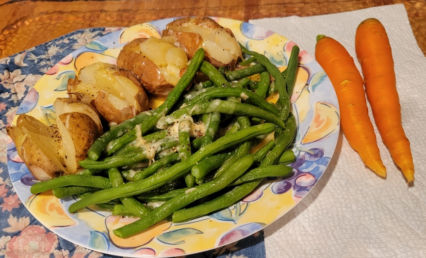 Roasting any vegetable tends to make it taste even sweeter. Below we have roasted peppers, steamed carrots, and eggplant. And russet potatoes, steamed beans, and raw carrots. And bi-cabbage coleslaw with pecans, Craisins and cucumbers in a sour cream dressing.