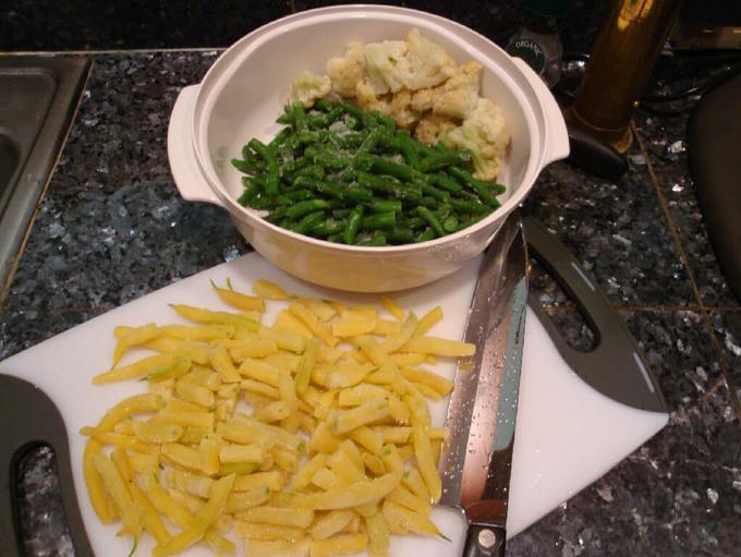 These three veggies were blanched last harvest season at their peak of flavor. Today they are fresh from the freezer where there were stored separately in air-tight, freezer bags. Yellow beans, green beans, and cauliflower will be part of a stir-fry meal.