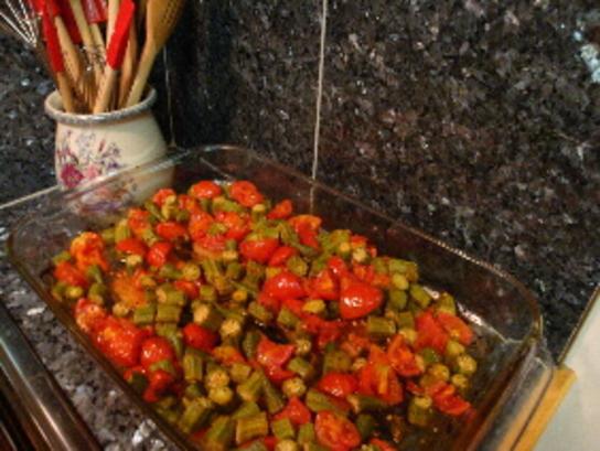 Alternative One: In a glass baking dish, place uncut okra. Drizzle with olive oil seasoning with salt and pepper, as desired. Roast in a 375 degree oven for 10 – 15 minutes. Roasting tends to eliminate the slime to the great extent that you might consider even slicing the okra for this alternative (as pictured above). Tomatoes may be added to the mix, if desired.