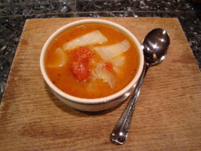 Acorn squash, indeed, any winter squash makes a hearty, nutritious winter soup. Vine-ripened tomatoes roasted at their peak flavor and then frozen are a vital component to many of our soups and sauces. This soup is topped with additional sautéed onions.