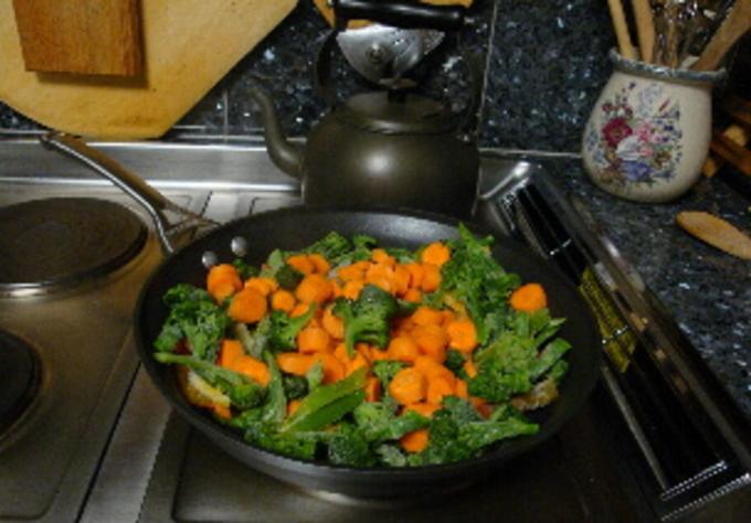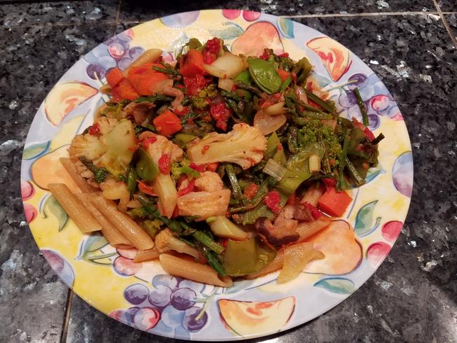I keep bags of “mixed vegetables” in the freezer. And I keep bags of “same veggies” in the freezer. It all depends on what is available at the time of freezing! When it comes to a quick stir fry, they are ALL good. Using whole wheat organic pasta will add an even healthier touch to your meal.