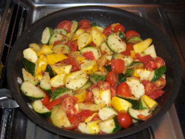 This colorful mix of onions, peppers, zucchini and summer squash is sautéed to perfection in butter. If you get tired of eating these veggies in the summer, saute or blanch them and pop them into the freezer for later.