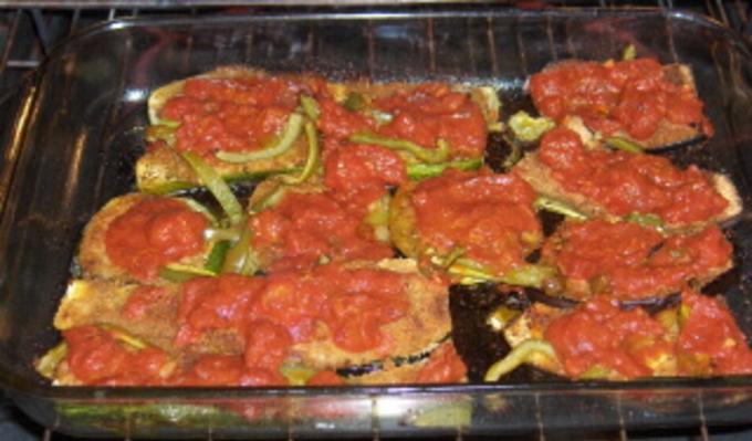Sliced eggplant baked with our home-canned tomato sauce and topped with sliced green bell peppers. These will be topped with Mozzarella Cheese as a final step before serving! Eggplant slices are excellent served either hot or cold. And they freeze well! We layer them three deep in a freezer container. They can be defrosted in the microwave and heated at a low power. Or in the oven or a steam oven to provide another delightfully fresh taste of summer vegetables!