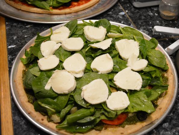 We make our own gluten-free pizzas starting with a tomato-base sauce made from our own tomatoes or perhaps a pesto base made from our greens with sliced romas. Next, we add black olives, sauteed mushrooms, and sliced bell peppers which we have frozen and waiting. Then, we layer on fresh greens. If the greens are large, we just chop them up a bit to make them bite sized. Top with fresh mozzarella and into the oven it goes. Into each life a little pizza must flow. We make it healthy!