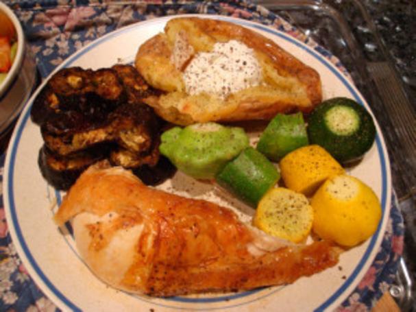 Roasted organic chicken, a potato, grilled eggplant, and whole steamed squash and zucchini for a different perspective. Be sure to note the small size of our patty pan squash! We strive to harvest our veggies at the peak of their perfection. This is why we use the word “gourmet” in reference to the vegetables we put into Cane Creek Asparagus & Company CSA boxes!