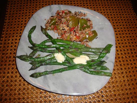 Sautéed Peppers and Wild Rice with Asparagus Spears