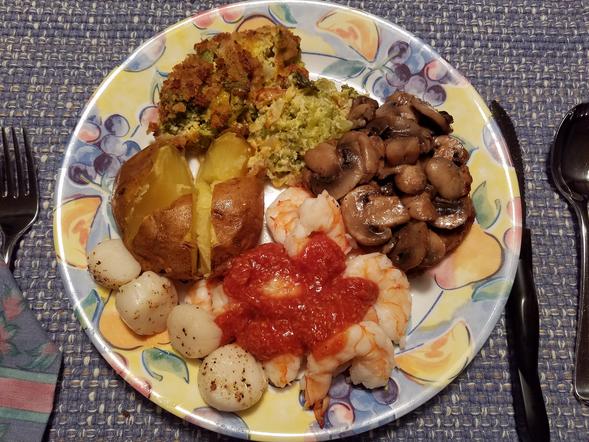 Seafood with Broccoli Casserole, Mushrooms and Baked Potato