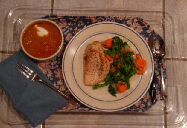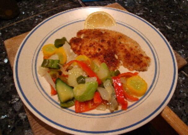 More baked deep-sea fish and vegetables. This is a small Sheep’s Head fillet, I believe, with a colorful sauteed mix of vegetables which are grown organically on our Fairview family farm in Buncombe County near Asheville, NC.