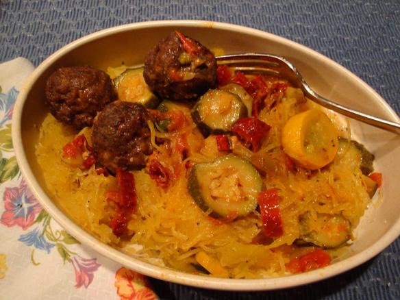 Steamed veggies & meatballs on top of spaghetti squash! All were previously frozen, but who would know? We find the soil on our Buncombe County farm perfect for growing many vegetable varieties.