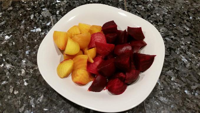 Peel and dice the beet. Peel the cucumber, if desired; however I just take strips off of the peel when using our cucumbers as I do not find them to be bitter, usually. Taste test to verify.