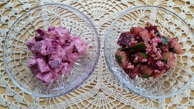 If you want a “less pink” salad (than on the left below), leave out the yogurt or sour cream (salad on the right) because the beets will turn the white to pink; however, doing so with give you about ten ounces less finished product, of course.