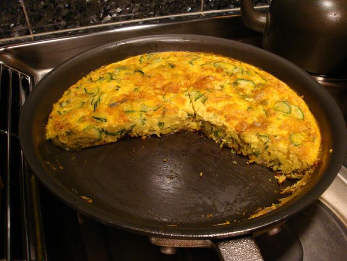 On the stove in an ovenproof pan, sauté the onions in the olive oil for 5 – 6 minutes. Add thinly sliced veggies (zucchini, squash, kohlrabi, bell pepper, corn, anything you have on hand) and sauté another 6 minutes. Any vegetables which are pre-cooked leftovers, simply slice and add to the pan.