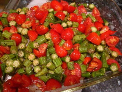 Alternative Four: In a glass baking dish, place uncut okra. Drizzle with olive oil and roast at 425 degrees for 10 – 15 minutes. Season with salt and pepper, as desired. Roasting tends to eliminate the slime to the extent that you might consider even slicing the okra for this alternative. I would put some tomatoes into the mix, as well.