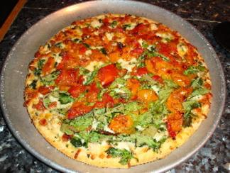 Sometimes we all get hurried and have to make a quick meal. Gone are the days of a plain store bought pizza. Even if you must start with one, you can change it up by adding a cup of fresh arugula (chop first and toss in lemon, pepper and olive oil), or sliced asparagus, or some fresh tomatoes. The possibilities are endless even if tomatoes are not available year around. We made this pizza using roasted tomatoes which we had in the freezer from late last summer. Nothing goes to waste in our household. Please don’t knock fresh frozen veggies if you’ve never tried them!
