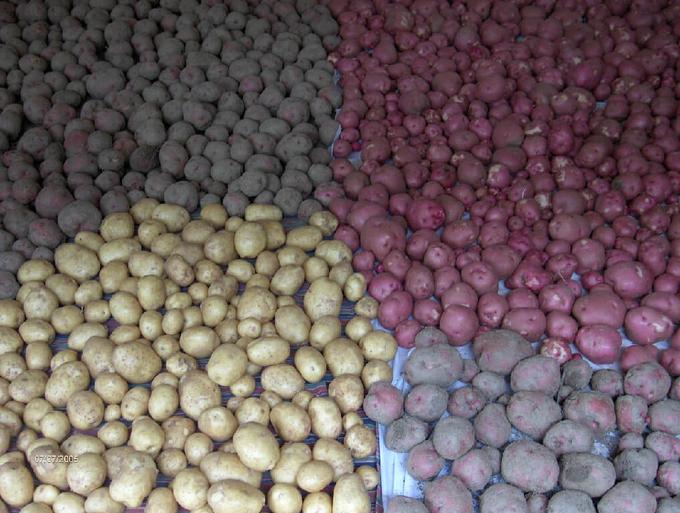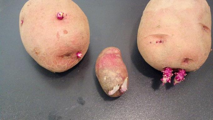 If in a couple of weeks you look into your potato bag and see little whitish or reddish things coming out of the potatoes, do not fear—your potatoes are simply sprouting! Never seen a potato sprout before? The reason is that most potatoes are routinely sprayed with a growth retardant to prevent them from sprouting. But, our potatoes are living food—thus they will sprout! The roots will not hurt the potato or you! Just rub them off with your fingers and prepare them as usual.