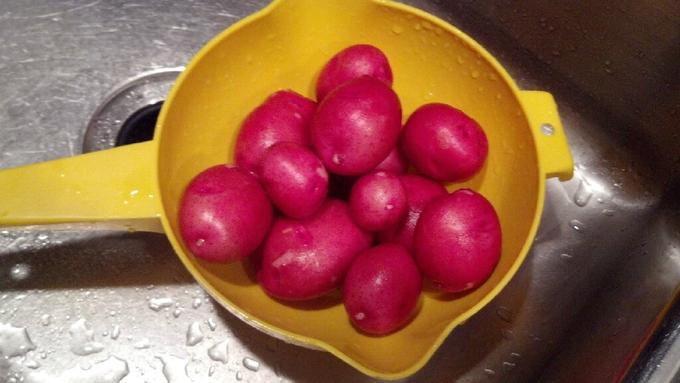 All new potatoes, whether red, white, gold, or salad fingerlings, contain less starch than store bought potatoes and will be heavier in weight due to the moisture content. The tender skin can be rubbed off with a vegetable brush (or your fingers), if you desire. You will discover they have a creamy texture and are wonderful simply steamed and served with a dab of butter and perhaps, grated cheese.