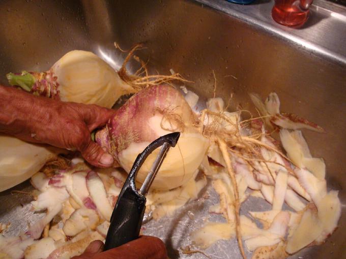 Peel rutabagas with a vegetable peeler. Leave the stem and root as the last to remove so that you will have a “handle” for this peeling process! Slice the peeled rutabaga into strips. Drizzle them with olive oil (plain or any flavor you desire) and add a bit of salt. Place on a nonstick baking sheet, if available. Bake at 425 degrees about 15 minutes until golden brown and fork tender, turning as necessary. Or you can pan roast them on the stove. Sprinkle with a seasoned, specialty salt just before serving, if desired.
