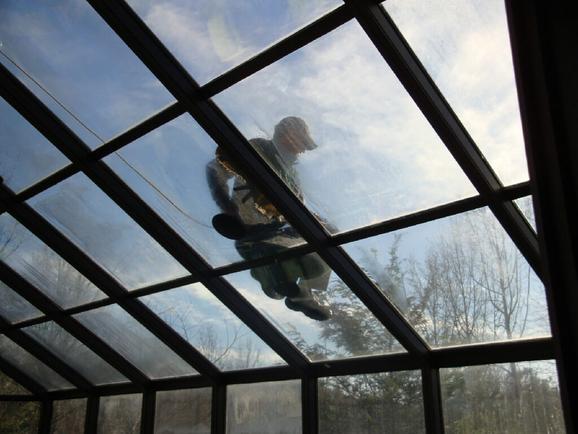 Our Cane Creek Asparagus & Company greenhouse is maintained by individuals I lovingly call Spidermen. When exhaust fans need to be repaired, a window pane replaced, or a seal repaired, it takes special equipment and skill to move around three stories up on the glass rooftop of our greenhouse. Our Super Heroes are Bill Kater and his son, Will Kater, of Pool Enclosures, Inc.